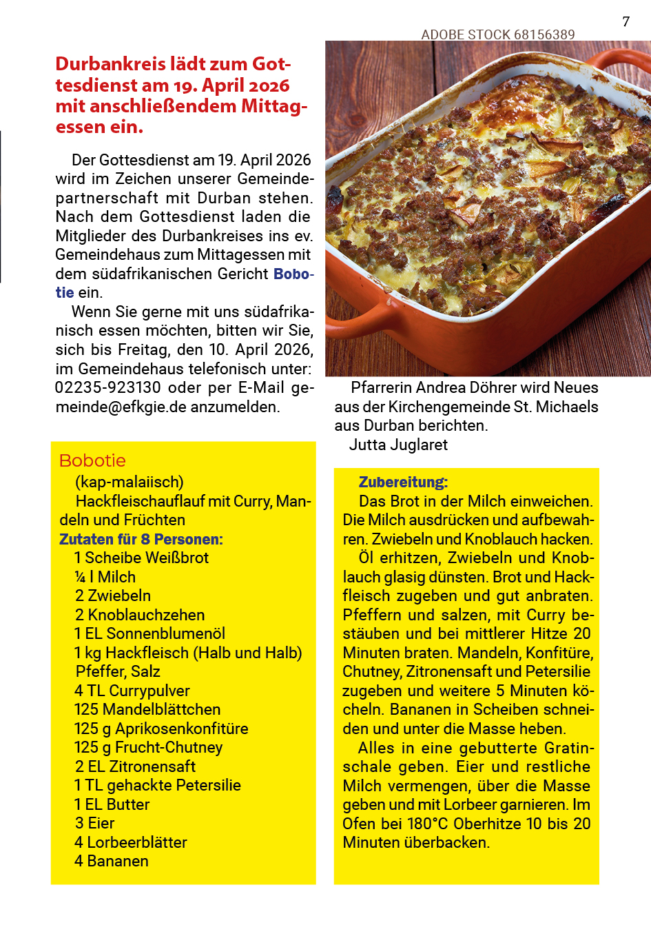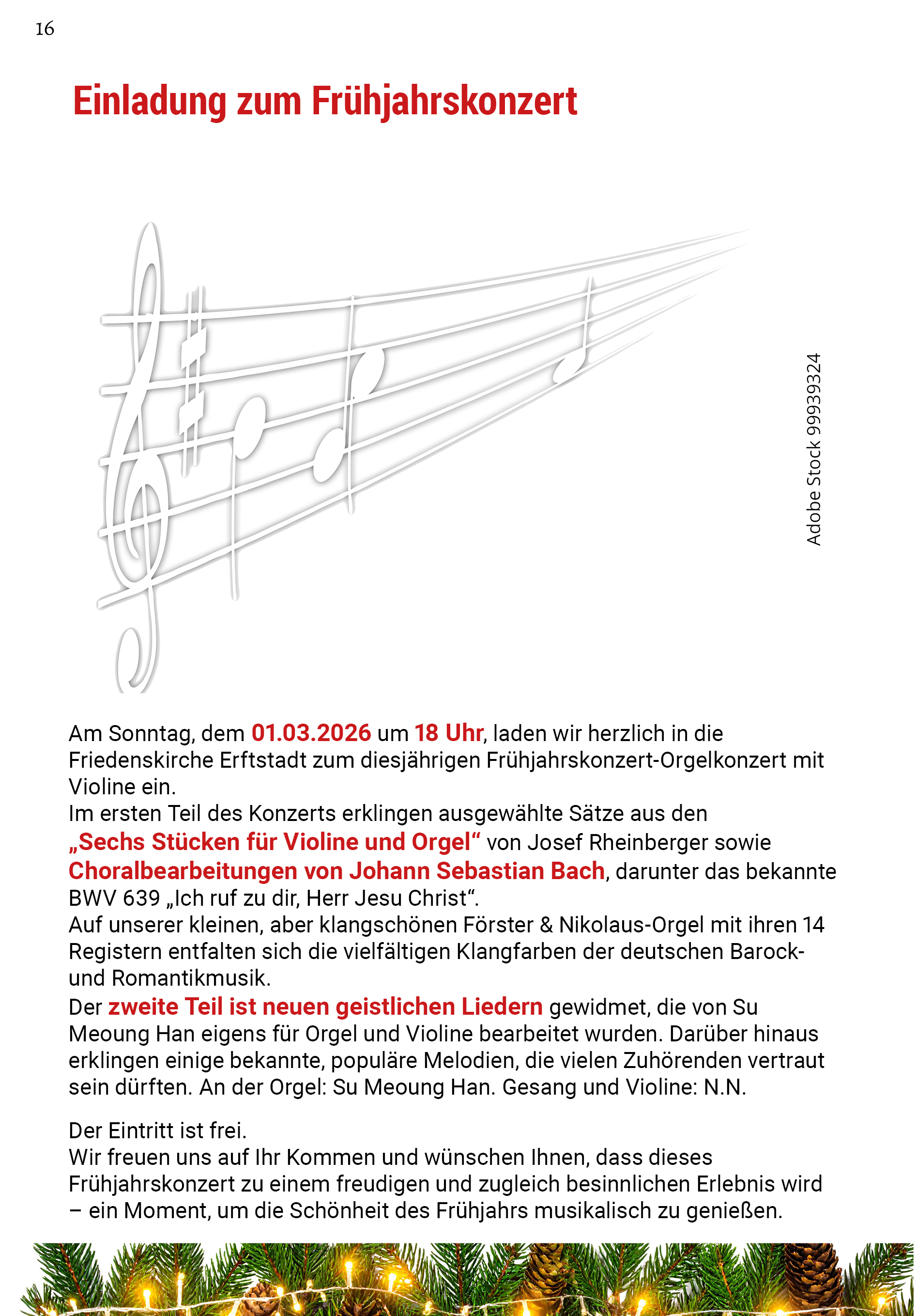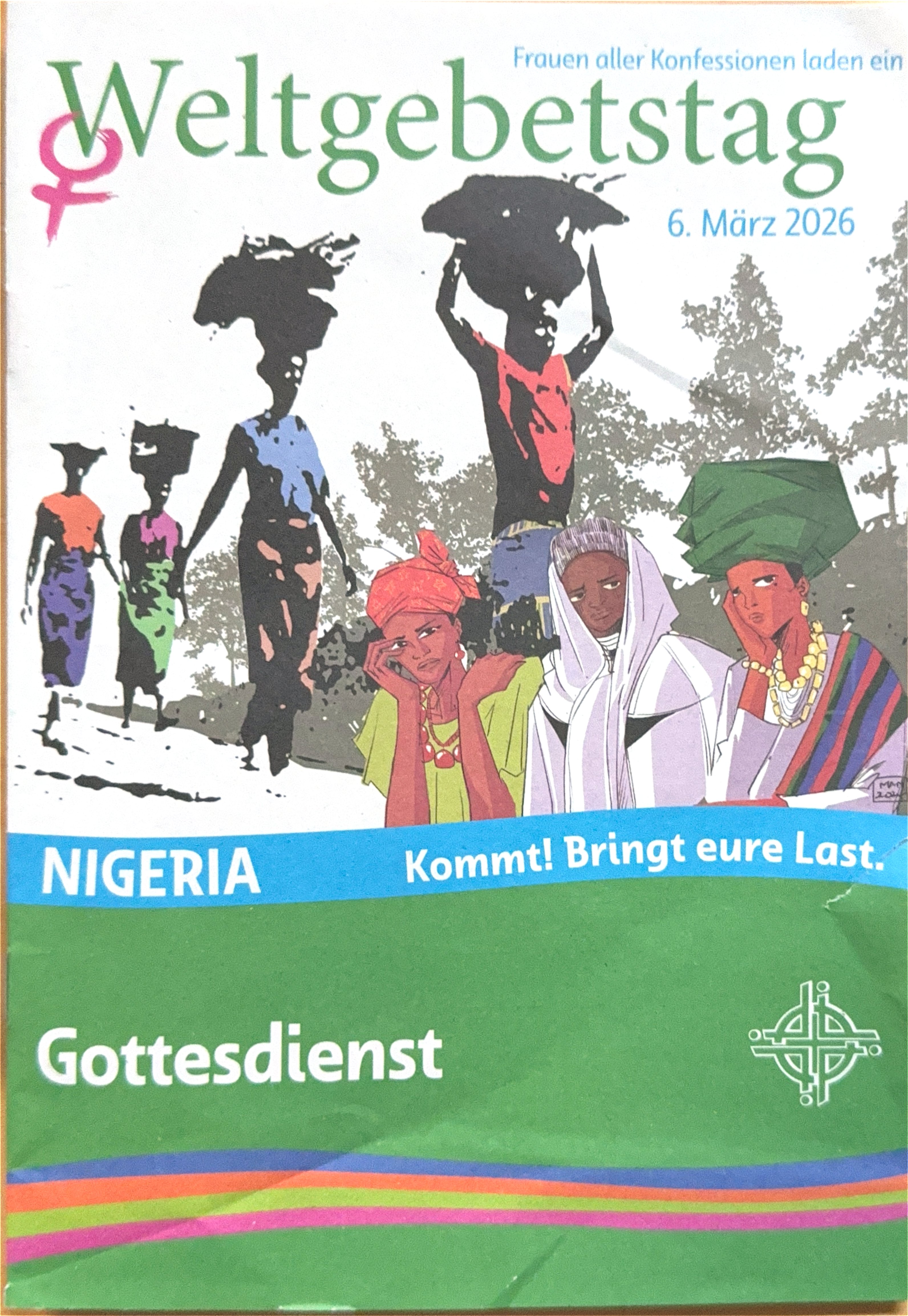 Weltgebetstag am 06.03.2026 in der Friedenskirche um 17.00 Uhr. Frauen aus St. Alban, St. Barbara, St. Josef, St. Lambertus, St. Michael und der Friedenskirchengemeinde in Erftstadt laden herzlich zum Gottesdienst ein. Die musikalische Begleitung übernimmt Herr Bauer vom CVJM. Im Anschluss an den Gottesdienst laden wir zum gemeinsamen Gespräch ins Gemeindehaus ein. Für Essen und Trinken ist gesorgt.